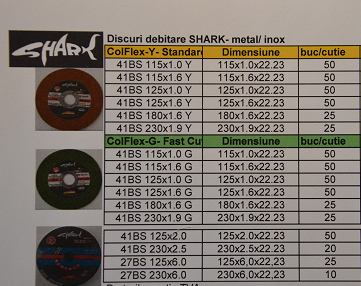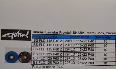 Produse principale: Discuri Lamelare Frontale cu granule de zirconiu, marca Shark : 115x22 si 125x22 in granulatii P40, P60, P80.